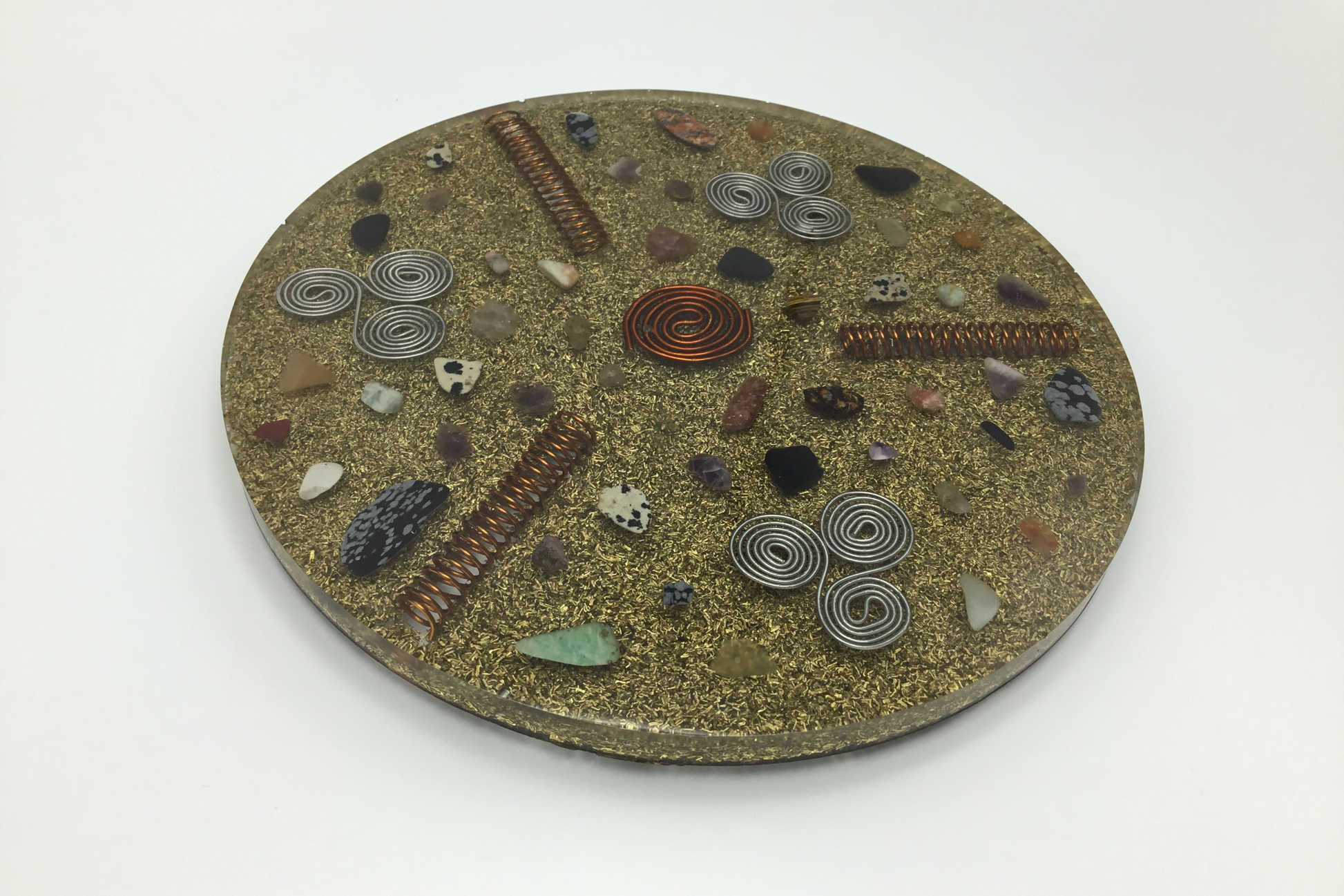 Each charging disc also contains tensor spirals, round spirals, and/or triskelion(s) which, together with the crystals, amplify the orgone energy. Discover more about the effect of these symbols and the crystals used.